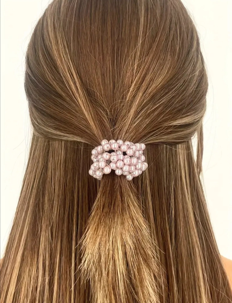 Velmi krásná gumička do vlasů s umělými perličkami v růžové barvě.