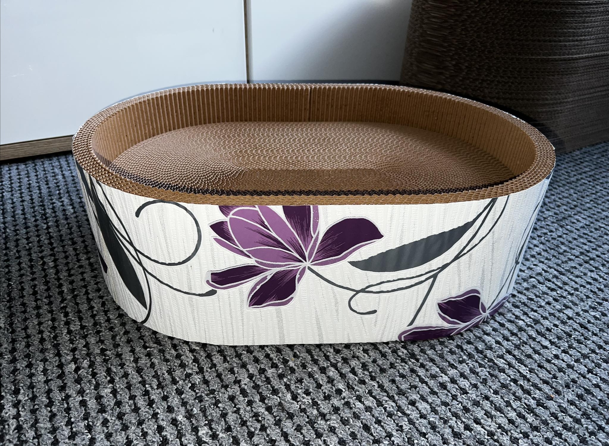 Luxusní kartonový pelíšek a škrabadlo 50 cm fialová kytka. Vyrobeno z nejkvalitnější kartonové lepenky na trhu. Vaše kočky Vám poděkují, protože kartonový pelíšek poskytne nejen útočiště pro spánek, ale především si budou své tlapky a drápky udržovat v dobré kondici. Kočky to prostě milují 🐾. A Vy budete spokojeni také, protože nebudou mít touhu ničit váš nábytek.