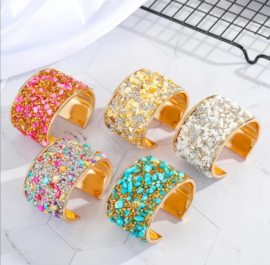 Luxusní dámské náramky šíře 5cm v pěti barevných variantách se zlatým podkladem. Nabízíme v těchto barevných provedeních : bílá, žlutá, růžová, tyrkysová a multicolor.
