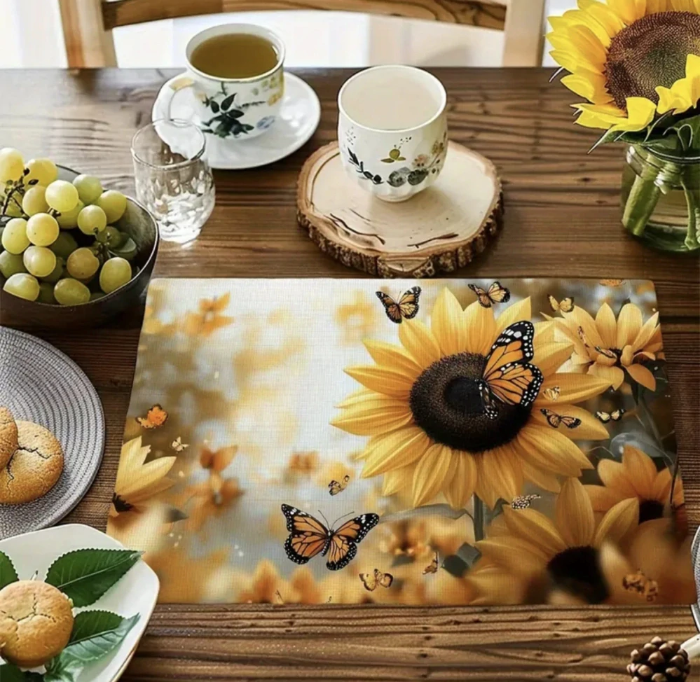 Luxusní sada prostírání s tématikou květů slunečnic - naše luxusní prostírání s motivem slunečnic a motýlů je dokonalým doplňkem pro každý domov, který touží po svěžesti a eleganci. Detailní potisk zachycuje zlaté odstíny slunečnic v plném květu, doplněné o ladně poletující motýly. Tento motiv vnese do vašeho interiéru pocit klidu, pohody a pozitivní energie. Je ideální pro každodenní použití i slavnostní příležitost.