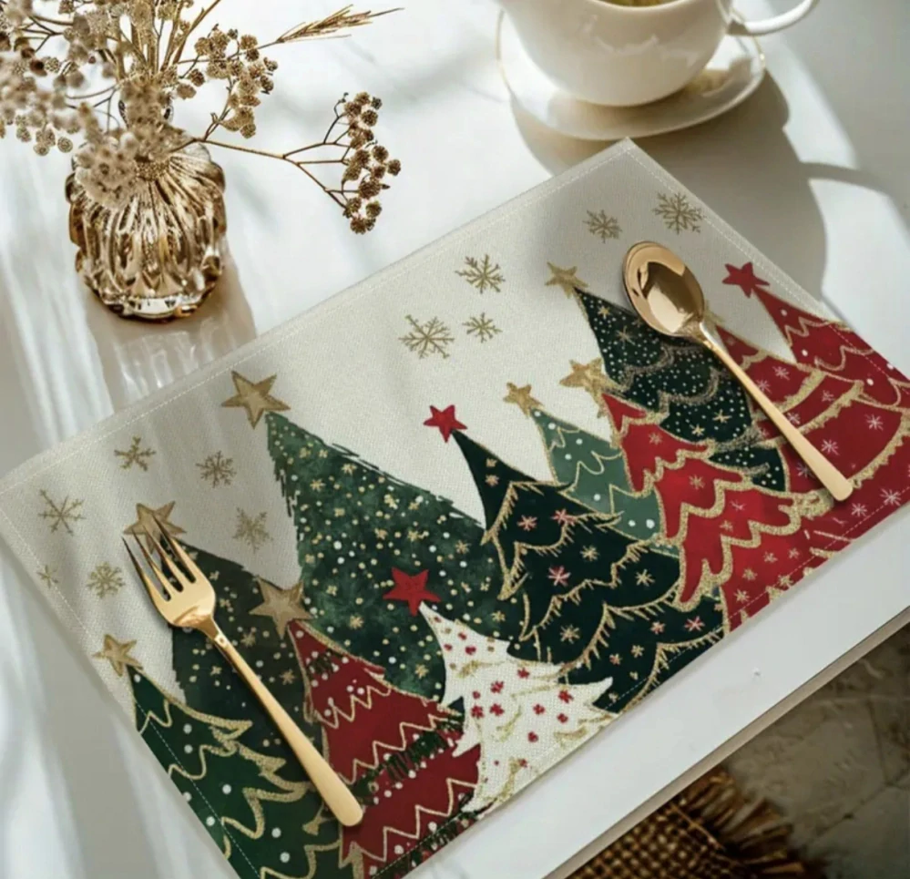 🎄Luxusní sada prostírání pro dokonalou atmosféru Vánoc 🎄- dodejte svému stolu punc luxusu a jedinečnosti. Toto prostírání z kvalitní lněné tkaniny vyniká vánočním designem, s bohatě zdobenými stromečky v červených, zelených a zlatých barvách. Jemné sněhové vločky a hvězdy dodávají celé kompozici luxusní nádech, díky němuž se každé stolování promění v slavnostní okamžik.