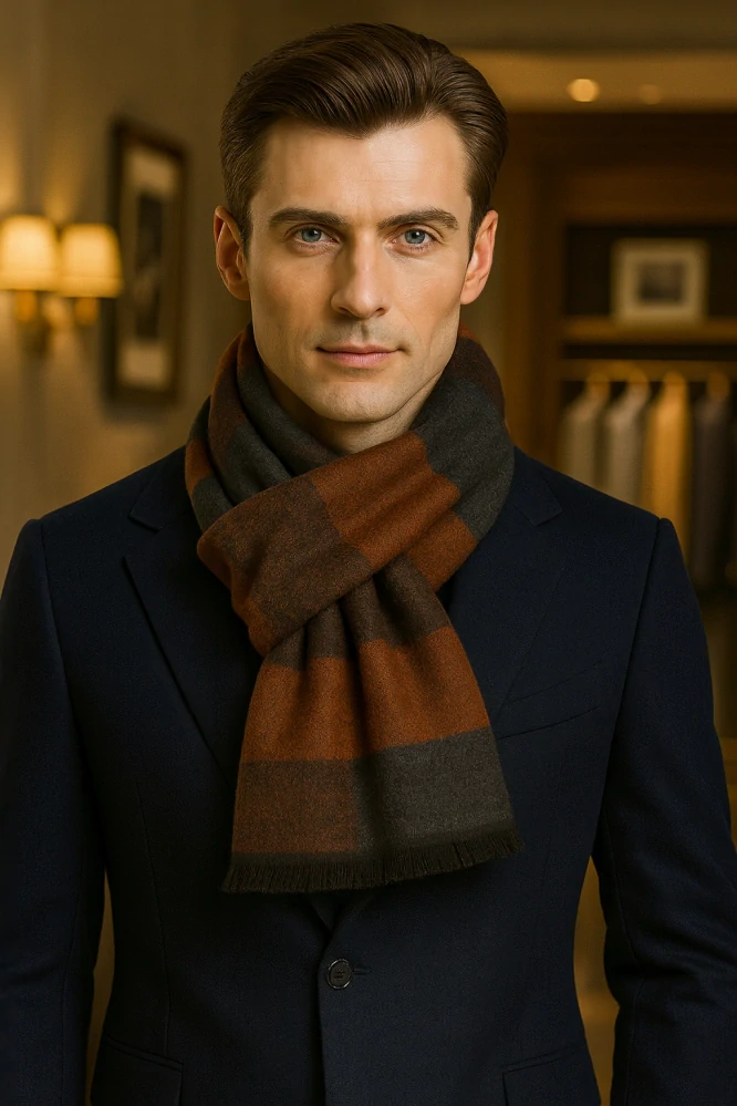 Představujeme šálu pro moderního muže, která kombinuje špičkový design s praktickou údržbou. Kombinace syté cihlové a hluboké antracitové barvě je dokonale univerzální. Elegantní krátké třásně na zakončení podtrhují celkový sofistikovaný design. Ideální k obleku, ale i pro každodenní nošení.