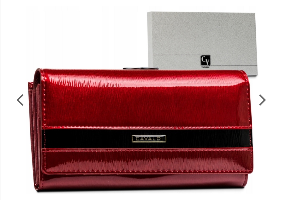- Prostorná dámská kožená lakovaná peněženka s černým pruhem v červené barvě v dárkové krabičce. Vyrobeno z vysoce kvalitní přírodní hovězí kůže pokryté lakem , na přední straně peněženky najdete decentní logo Cavaldi ve zlaté barvě. Uvnitř peněženky kvalitní logovaná výstelka , která chrání peněženku před opotřebením kartami při častém použití. Velmi praktická a prostorná peněženka je rozdělena na dvě části.