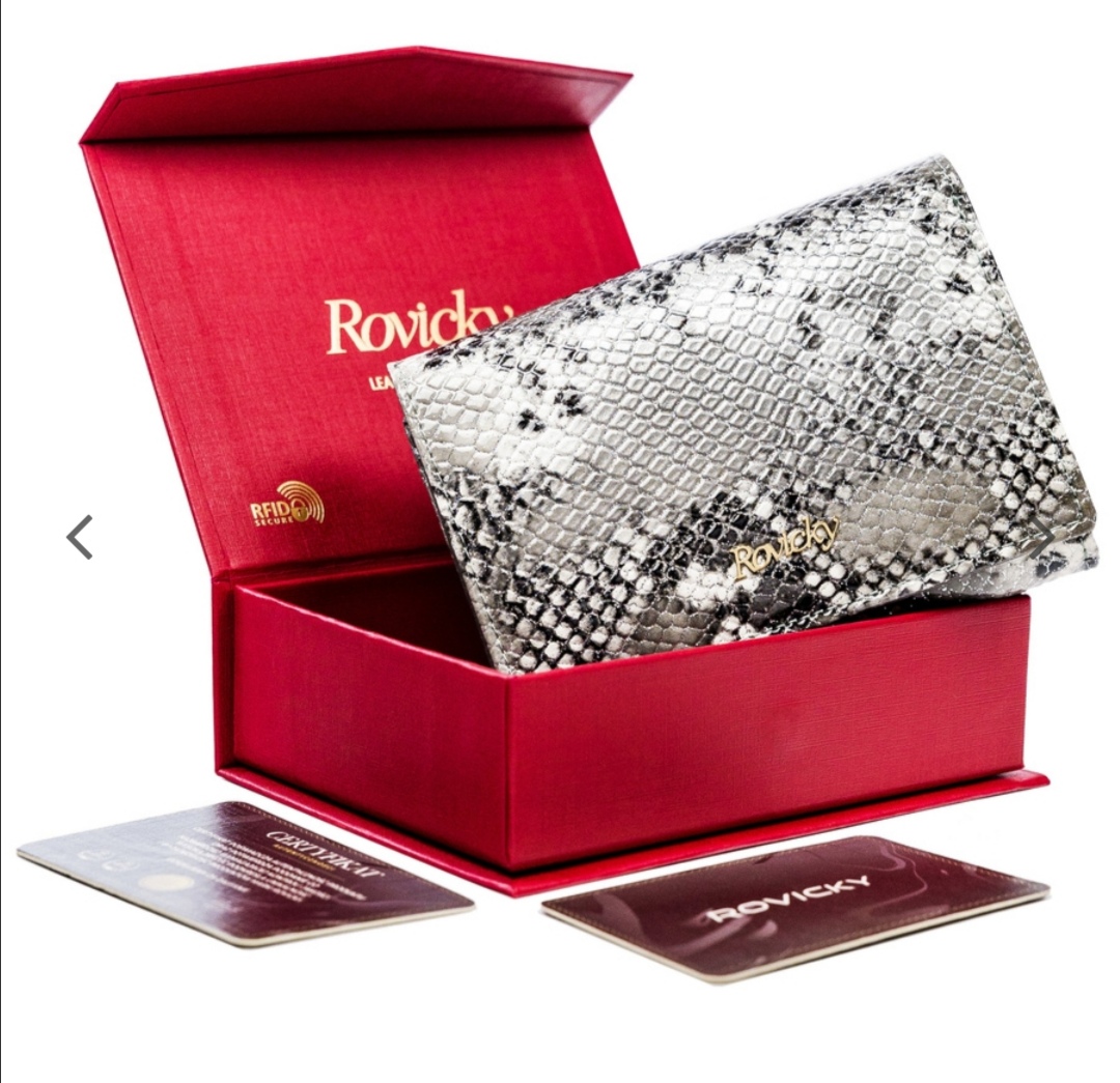 - Luxusní střední dámská kožená peněženka se vzorem hadí kůže ve stříbrné lesklé barvě v dárkové krabice. Je vyrobena z vysoce kvalitní přírodní kůže , uvnitř peněženky kvalitní logovaná výstelka chrání před opotřebením kartami a opatřená jemným a decentním logem Rovicky na přední straně peněženky ve zlaté barvě.