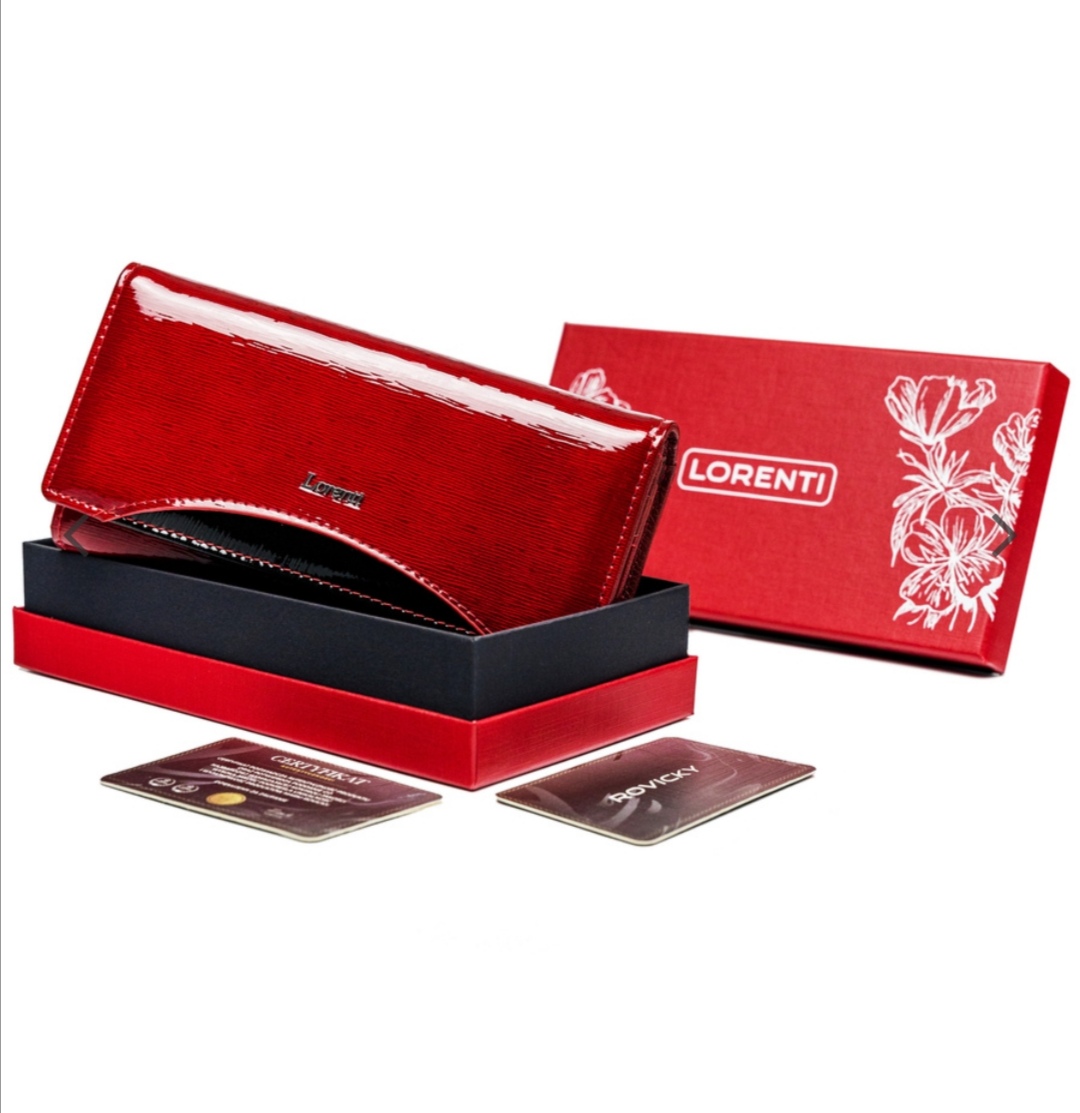 - Jedinečná dámská velká kožená lakovaná peněženka se zajímavou černou vsadkou od známého výrobce Lorenti s dárkovou krabičkou